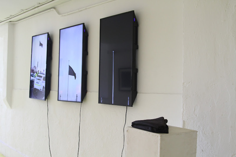 > PIGS y otros proyectos pretos.Quinta del Sordo, Madrid. (16)![]() Exposición individual de Mario Gutiérrez Cru comisariada por Domix Garrido. ENTRE LA ILEGALIDAD AUTORIZADA Y LA AUTENTICIDAD PERSONALPIGS y otros proyectos pretos es el titulo que recoge cuatro obras diferentes entre si pero con el nexo coyuntural común muy definido. Son obras que su creador, Mario Gutiérrez Cru nos ofrece en este momento de incertidumbre política, de cambio, de rebeldía. Un momento históricamente transcendental del que aún no somos conscientes pero que tiene mucho que gritarnos; un hecho político y social que nos lame los oídos, hartamente taponados desde el inicio de la historia contemporánea de éste nuestro país. ¿Engañados, cansados...? ¿Este es el origen inconsciente de sus acciones? Respecto a Banderas pretas: Spain realizada en Jaén debemos matizar que si atendemos al origen, al significado de una bandera, ésta nos orienta hacia la señalización del linaje de un Monarca o Señor, a la representación de una nación, comarca, corporación o incluso hacia una señalización personal como elemento distintivo. Pienso que el artista ha hecho suya una bandera sin nombre y sin patria, sin Monarca ni emblema, una bandera atónita, muda, callada como el golpe de un fornido boxeador sobre un dictador sin laringe: contundente. En PIGS, la chirriona mezcla de himnos patrios reivindican una diferenciación, una identidad apaleada y ensombrecida por la gregaria tabula rasa europea que desvaloriza el rasgo, inmiscuyendo a los países infectados al establo adocenado de la globalización. No contento con todo esto, Mario Gutiérrez Cru nos empuja aún más al abismo de la incertidumbre realizando la acción Bandeira Preta junto al artista mexicano Andrés Montes la misma tarde de la inauguración, donde incidirán en una nueva vejación a su bandera personal, arrastrando su significado por el quebrantado Madrid... para terminar abandonándola a su suerte. La cuarta obra imprime un carácter performativo a la exposición, Black News permitirá el acercamiento a su mundo preto, al tacto y al olor de la censura, una apropiación artística al proceso irremediablemente perpetuo, por desgracia. Será una aproximación tan real como las experiencias ekfrásticas que he tenido el placer de compartir junto al artista. Domix Garrido Abenza Murcia, enero 2016 Comisario > BANDEIRAS PRETAS: SPAIN. 07.03.2013Vídeo-Instalación tri-canal HD en pantallas de 40" + bandera negra. 07.03.2013. 18h. Plaza Jaén por la Paz.Acción-intervención realizada por Mario Gutiérrez Cru en la ciudad de Jaén, dentro del marco del 9º ABIERTO DE ACCIÓN, coordinado por Domix Garrido y David Martínez, director de la feria ARTJaén 2013. TRÍPTICO Bandeiras Pretas: JAÉN. Intervención en el paisaje urbano de la ciudad de Jaén, del artista Mario Gutiérrez Cru continuando con sus obras anteriores en las que de manera metafórica tachaba, borraba conceptos de identidad y de patria. En esta ocasión cambió la bandera de España por una "bandera negra", apolítica, afronteriza, simplemente un vacío de nacionalidad en un mundo universal, totalitario, totalmente unificado, donde el individuo está acotado y la posibilidad de cambio, mutilada. La intervención realizada con permisos de la delegación de cultura y policía fué censurada. Tres horas después de la misma, tras una serie de conversaciones entre el concejal de cultura, alcalde, director de la feria David Martínez y policía, la bandera fué quitada por parte los bomberos esa misma noche y un coche de la delegación de cultura se desplazó a recoger la bandera de España a los aposentos del artista a las 23.30h de esa misma noche. A la mañana siguiente, volvía a ondear el símbolo patrio. El hecho fue callado y los periodistas que filmaron y fotografíaron la acción no pudieron publicarla al día siguiente, así como la entrevista realizada momentos antes de la acción para una televisión andaluza, fue capada cuando Mario Gutiérrez Cru iba a explicar las razones de su acción. Sólo 2 días después todos los periódicos hicieron eco de lo sucedido y el propio alcalde amenazó con poner una multa, apesar de como decíamos tener todos los permisos y estar en todos los programas. El artista recuperó de los bomberos la "bandeira preta" que junto a las grabaciones realizadas por varios equipos profesionales formarán parte de la futura video-instalación, que con la acción y el objeto, así como todo la información y revuelo que ha causado, darán sentido a la pieza. La acción parte de trabajos anteriores en los que el artista ha trabajado los últimos cuatro años en los que ha intervenido periódicos, mapas, fotografías borrando símbolos, informaciones, publicidades y contextos. En el caso de los periódicos "Breaking News" se tacharon los textos de periódicos recogidos por el propio artista en ciudades por las que pasado, así como en una exposición en la Fundación IDFX de Breda, Holanda, se invitó a los propios espectadores a tacharlos. Así mismo en la residencia realizada en la susodicha fundación, Mario Gutiérrez Cru fotografió el centro histórico de la ciudad y tachó toda la información de las fotografías tomadas y el resultado final fue una retroproyección que pudo ser vista desde el interior, así como el exterior de la propia sala de arte, invitando a la ciudadanía a reconocerse en esa ciudad anónima y sin información. Además realizó un periódico numerado y firmado con las casi 400 fotografías y una performance con la colaboración de un artista local. Este tipo de acción fotográfica se realizó también en el 2010 para la 2ª Bienal de fotografía y audiovisuales de Jaén, FOTOJaén 2010, en el que el artista fotografíó los edificios y calles más emblemáticas de Jaén y una vez más quitó todo la sobre-información. Estas fotografías se imprimieron en forma de carteles y pegaron en una de las calles peatonales más conc